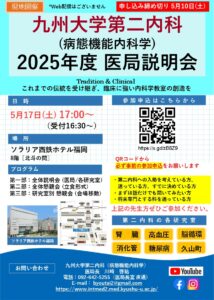 令和7年5月17日, 土曜日, 17時から、ソラリア西鉄ホテル福岡において、第二内科主催の医局説明会を開催いたします。